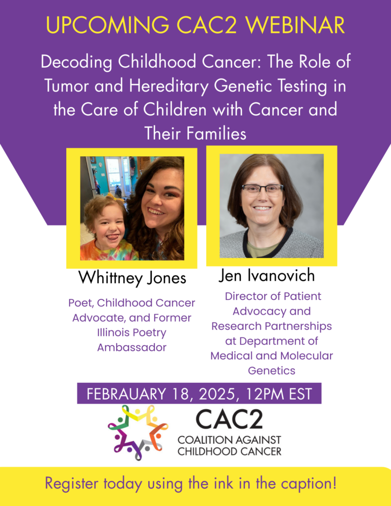 CAC2 invites you to join us for an upcoming webinar exploring the critical role of genetic testing in childhood cancer care: Decoding Childhood Cancer: The Role of Tumor and Hereditary Genetic Testing in the Care of Children with Cancer and Their Families on February 18 at 12PM EST.